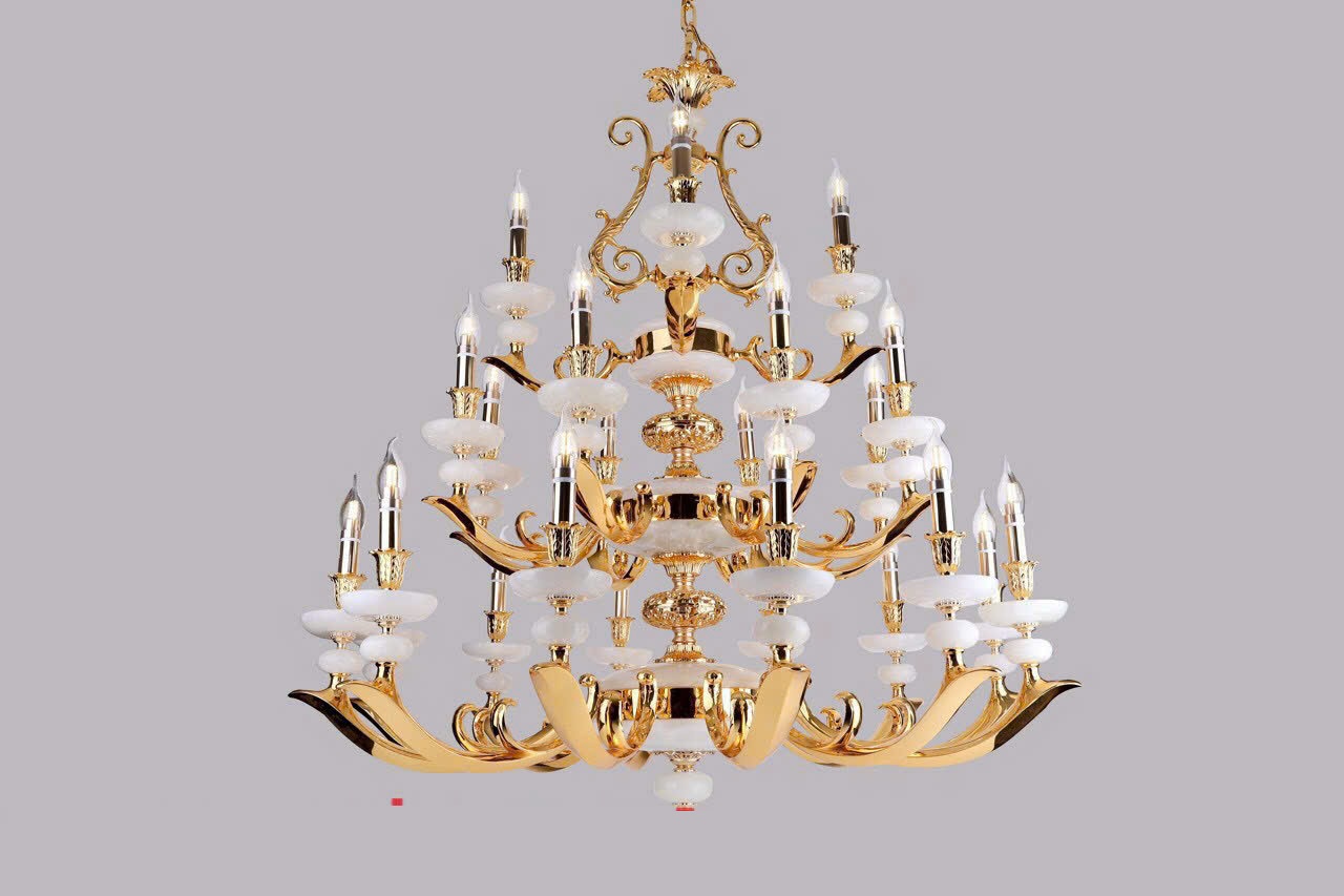 Đèn chùm đồng đá cao cấp Chất liệu: ĐỒng đúc, chao Đá cẩm thạch trắng tự nhiên Số lượng tay : 24 tay KT: Ø1100*1500 mm Bóng đèn: Bóng led tiết kiệm điện E14*24 Bảo hành: 2 năm